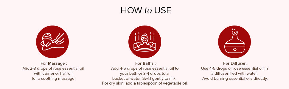Rose essential can be used for massages. Mix 2-3 drops of the essential oil into a carrier oil and hair oil, blend it well.