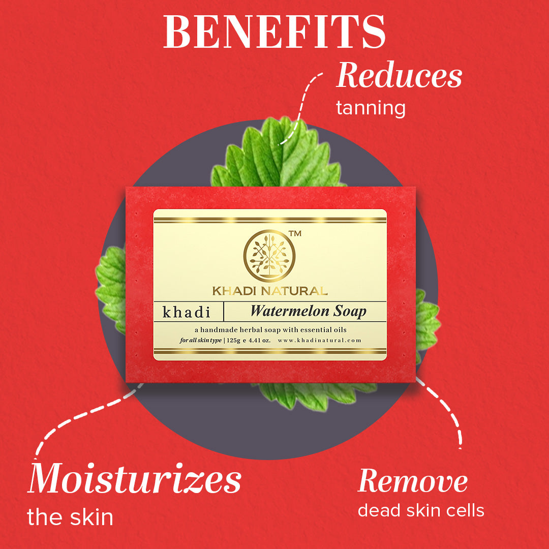 Khadi Natural Watermelon Soap has natural super-cooling properties that calm irritated skin. Infused with essential oils, this soap helps remove dead cells and makes the skin relaxed & bright. Regular use of this soap helps reduce tanning and also provides the required moisture to the skin which makes the skin fresh and youthful.