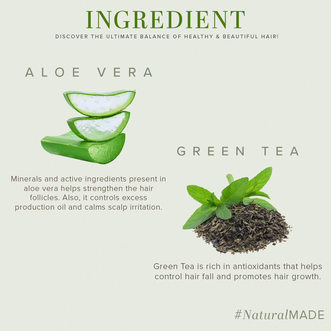 Indulge in the goodness of our Green Tea & Aloe Vera Hair Conditioner, crafted without parabens and SLS. This gentle yet potent formula is enriched with Green Tea and Aloe Vera to deeply nourish and moisturize your hair and scalp. Enjoy the refreshing and fragrant cleansing experience that revitalizes your hair, while the catechins in green tea work to combat hair fall, leaving your locks looking healthier with each use.