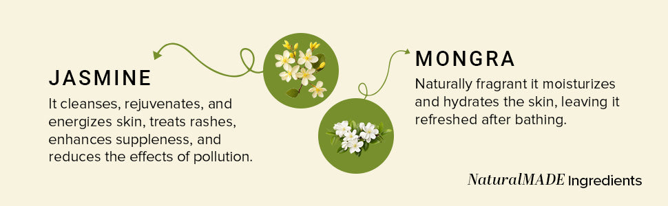 Indulge in the luxurious experience ofย Jasmine & Mogra Body Wash, a moisturizing yet non-greasy formula that gently cleanses your skin while preserving its natural oils. Enriched with the delicate floral scent of jasmine and mogra, this body wash leaves a long-lasting fragrance. Its gentle, SLS & paraben-free formula nourishes and purifies the skin, improving elasticity with each use. Say goodbye to dirt and grime as this gentle cleanser effectively removes impurities without stripping your skin of its natural moisture. Treat yourself to the ultimate shower wash experience with our jasmine & Mogra Body Wash.