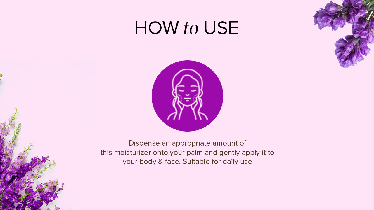 Lavender Moisturizer is a unique formulation with natural ingredients and is free from harmful chemicals. It provides vital nourishment to the skin with its advanced moisturizing formula. Its natural action removes dead skin and revitalizes skin cells, giving you fair, youngerlooking skin with a luxurious fragrance of Lavender that makes you feel refreshing and relaxing.
