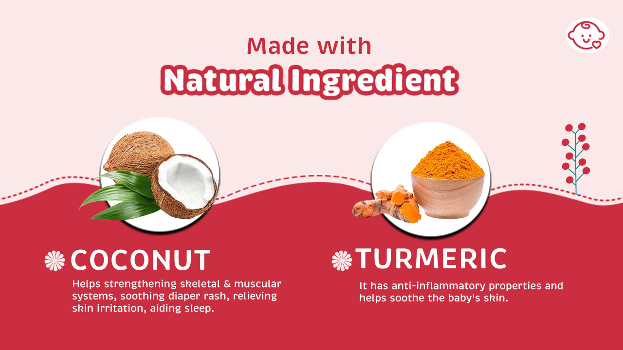 Coconut and Turmeric are my major ingredients that have magical healing properties. I retain maximum antioxidants and antibacterial properties that deeply hydrates your baby’s skin, boosts her growth and brings about a natural baby glow.