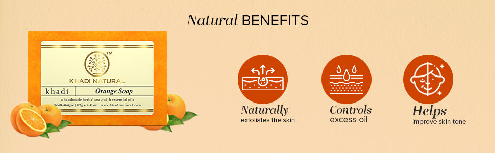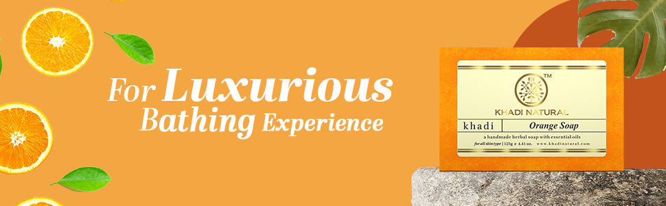 Cleanse, tone and nourish your skin with natural Khadi Herbal soaps. Khadi Herbal Orange Soap is a gentle, mildly exfoliating and very refreshing bathing soap. It has a Non-oily, non-detergent formula which is safe and effective for all skin types to remove make-up and build-up from the skin's surface without drying.