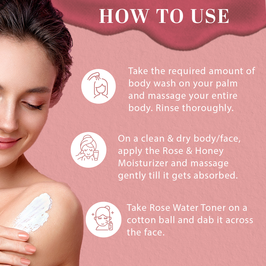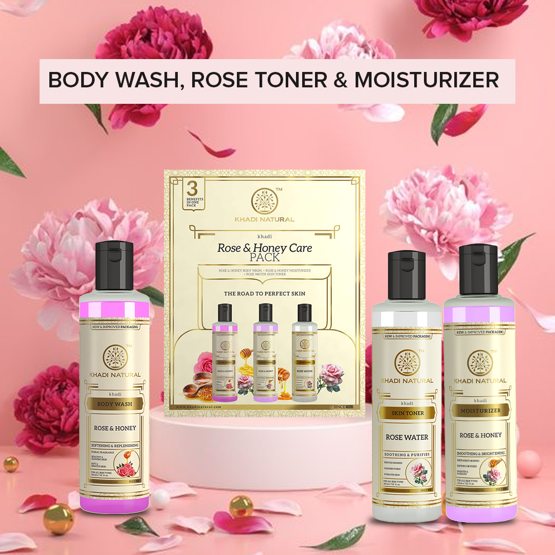 Inculcate the goodness of roses and honey in your skincare regime. This care pack includes a face toner, body wash, and moisturizer.