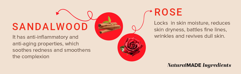 Khadi Natural Sandalwood & Rose Face pack is infused with freshly picked rose petals, sandalwood powder, and aloe vera extract. The detoxifying and purifying action of sandalwood rose and aloe vera visibly tightens the skin with a natural glow. It is a highly effective formulation that refines and whitens the skin, improves texture, and makes skin smooth and supple. Sandalwood and rose help provide youthful radiance to the skin.