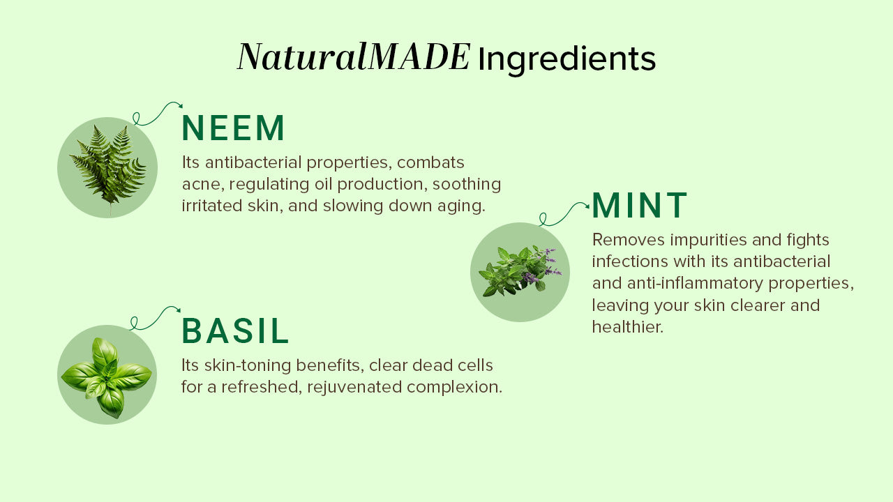 Neem, Basil & Mint Face Pack(Anti Acne) mask helps your skin get rid of the daily build up of toxins underneath your skin and at the same time get rid of bacteria,germs and dirt embedded in your skin to give it a natural glow.