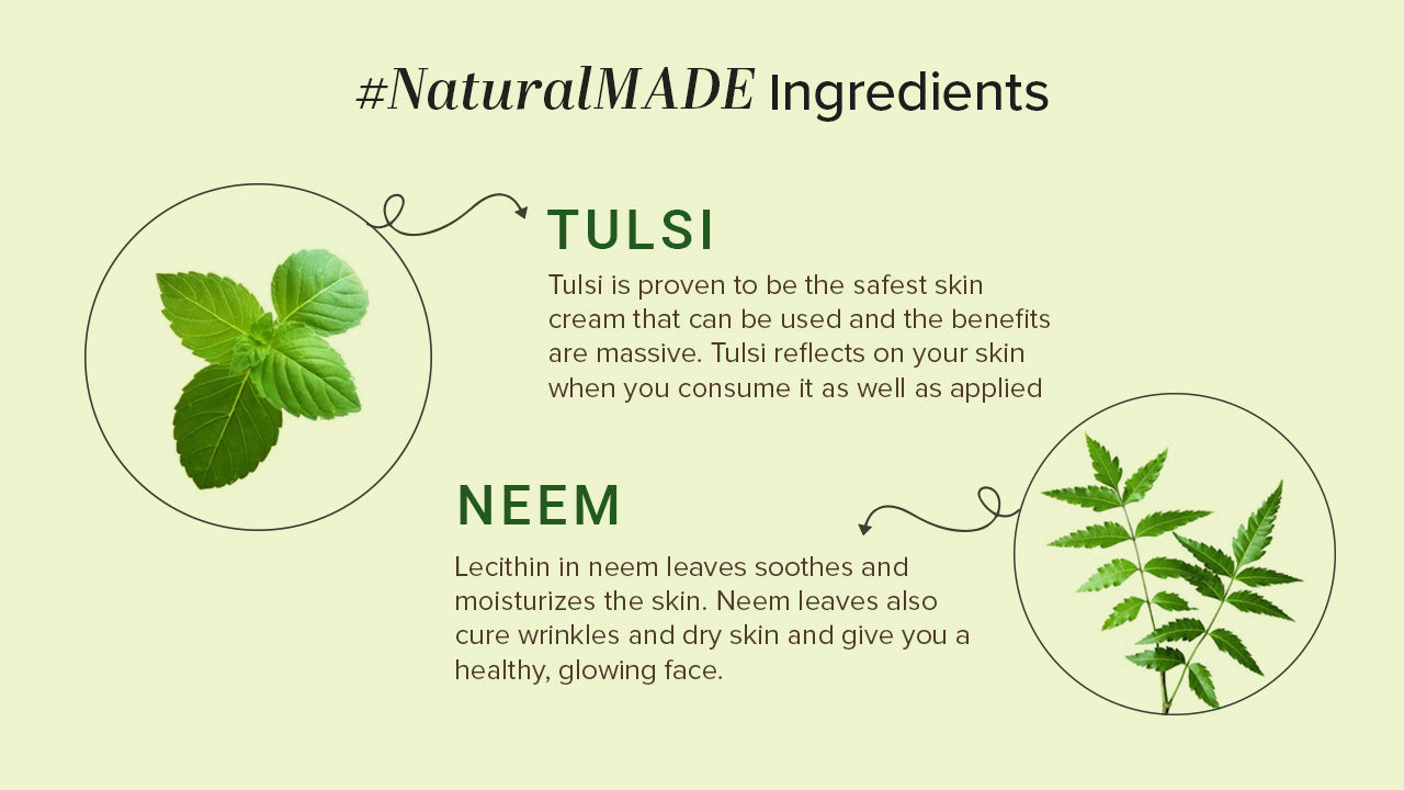 Neem & Tulsi Face Wash has been especially formulated with the goodness of Neem & Tulsi along with other rare and certified components like, Aloe Vera extract, Tea Tree oil, Wheatgerm oil etc. Neem has natural anti-fungal, anti-inflammatory, antiseptic properties that helps control excess oil secretions which prevents breakouts, repairs skin damage and treats acnes effectively. Tulsi comes with innumerable benefits for the skin that help enhance the health and texture of the skin in an all-round manner.